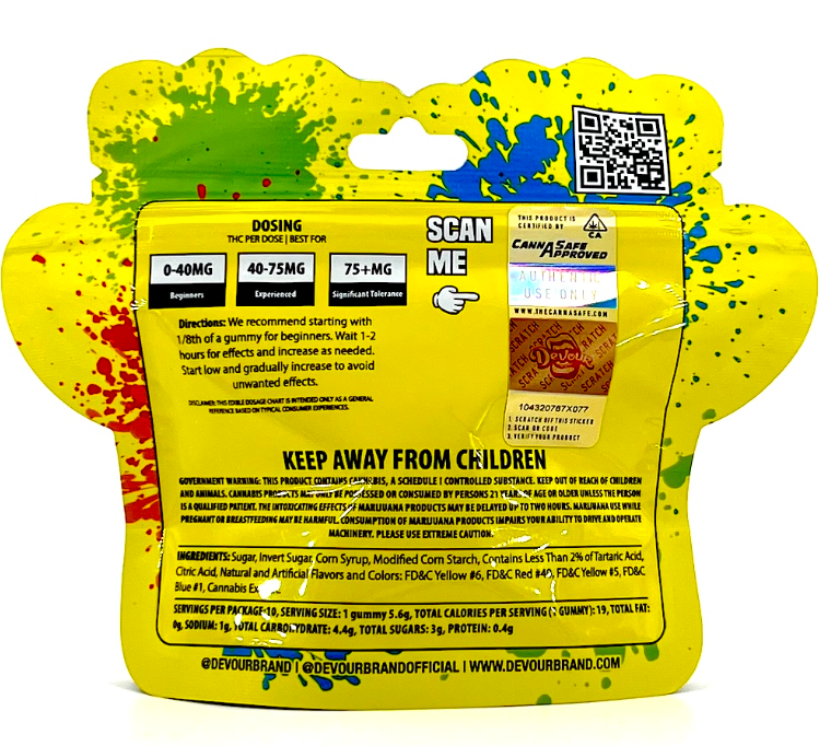 Devour Cannabis-Infused Sour Kids are flavorful, bite-sized edibles crafted with a sour candy twist. Each piece delivers a consistent dose of cannabis, offering a balance of uplifting euphoria and calming body relaxation. Perfect for discreet use and easy dosing, these edibles combine nostalgic candy flavor with reliable effects for both recreational and wellness enjoyment.